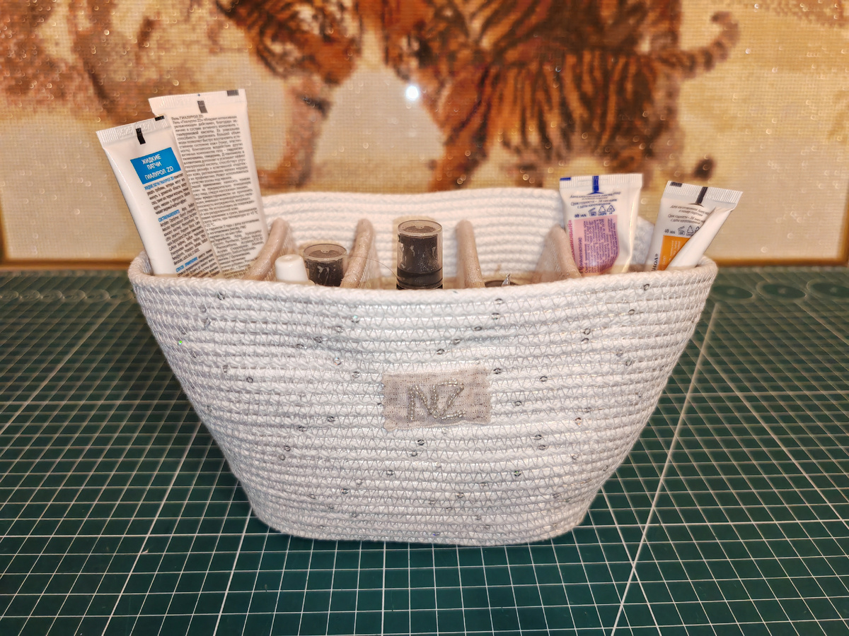 Теплого дня! Сделала для туалетного столика небольшой органайзер для косметики, под мои задачи он оказался очень удобным. Смогла распрелелить отдельно косметику для глаз, лица, сыворотки и кремы. Использовала белый шнур, но с добавлением пайеток он заиграл, получилось очень красиво. Конец шнура убрала под тесьму и на ней же сделала лого из бисера. Разграничители тоже украсила тесьмой.