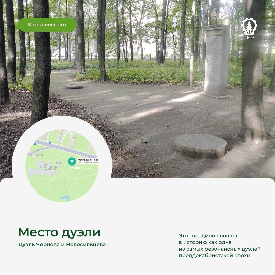 📒 Знаете ли вы, что живописный парк Лесотехнического университета хранит память о трагедии, которая всколыхнула высший свет? Осенью 1825 года здесь состоялась дуэль, потрясшая современников. Её итогом стала гибель двух молодых людей — поручика Владимира Новосильцева и подпоручика Константина Чернова. Этот поединок вошёл в историю как одна из самых резонансных дуэлей преддекабристской эпохи. А вы уже знакомы с этим местом? #картаЛесного 👻 МАХ | 📲 ВК | 📝 ДЗЕН