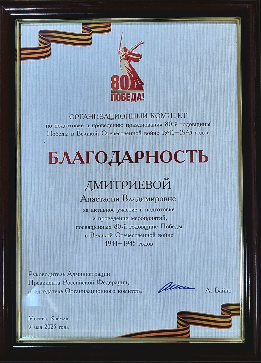 Сегодня корреспонденту "Первого Областного" вручили Благодарность Оргкомитета по подготовке и проведению празднования 80-ой годовщины Победы в Великой Отечественной войне! Благодарность с подписью руководителя Администрации Президента России и председателя Оргкомитета Антона Вайно получила наша Анастасия Гришина (Дмитриева). К годовщине Победы Настя снимала сюжеты о праздничных событиях в Орле, о людях, бережно хранящих память о страшных военных годах, а также была ведущей телемарафона "Вместе с Армией Победы". @Perviy_Oblastnoi Мы в МАХ