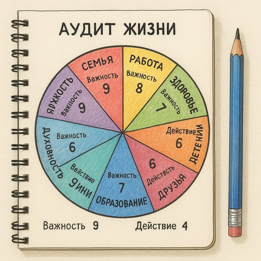 Теория — это хорошо, но пора перейти к практике! Это упражнение — одна из самых мощных вещей, которые вы можете сделать для себя. Оно сделает ваши ценности зримыми и понятными. Возьмите лист бумаги и ручку. Нарисуйте круг и разделите его на 10 секторов. Это ключевые сферы вашей жизни (можете адаптировать под себя): 1. Семья (отношения с родителями, детьми) 2. Брак/Отношения с партнером 3. Друзья/Социальная жизнь 4. Работа/Карьера 5. Образование/Личностный рост 6. Здоровье/Физическая активность 7. Отдых/Хобби 8. Духовность/Смыслы 9. Гражданская позиция/Помощь другим 10. Финансы/Благосостояние Теперь для каждой сферы задайте себе два вопроса: 1. Насколько эта сфера важна для меня *сейчас*? (Оцените по шкале от 1 до 10, где 1 — «совсем не важно», 10 — «чрезвычайно важно»). 2. Насколько я *действую* в соответствии со своими ценностями в этой сфере? (Снова оценка от 1 до 10, где 1 — «полностью игнорирую», 10 — «живу в полном согласии»). Что делать с результатами? Вы увидите «пробелы»: