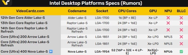 Появились новые слухи относительно архитектуры процессоров Intel Core Ultra 400K поколения Nova Lake-S. Согласно утечкам, Intel намерена ответить на доминирование AMD в игровом сегменте благодаря технологии 3D V-Cache (X3D), внедрив свой собственный аналог — Big Last-Level Cache (bLLC). Самой важной деталью является то, что огромный кэш объемом 144 МБ будет доступен исключительно в моделях с разблокированным множителем, обозначаемых индексом K (Core Ultra 400K). Технология bLLC призвана обеспечить значительный прирост производительности в играх, что позволит Intel напрямую конкурировать с чипами AMD Ryzen X3D. Объем в 144 МБ даже превосходит 128 МБ кэша, доступные в текущих топовых моделях AMD. По всей видимости, 144 МБ кэша bLLC получат только конфигурации с одним вычислительным чиплетом (Compute Tile), который включает до восьми производительных (P) и 16 эффективных (E) ядер. Флагманские процессоры Nova Lake с двумя вычислительными чиплетами (до 52 ядер) могут выйти без этой дополнит