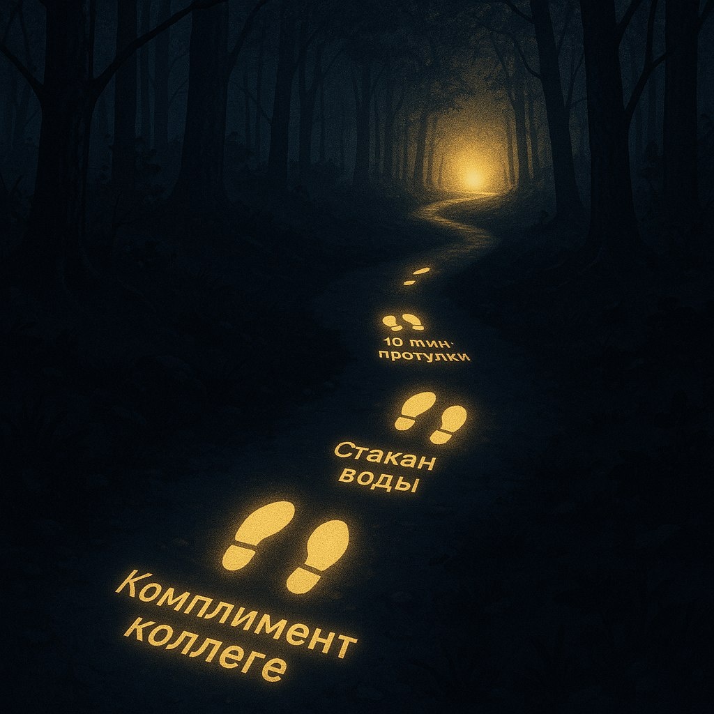 Последний, решающий навык ACT — Действие. Можно знать все техники и иметь прекрасный компас ценностей, но если не делать шагов, ничего не изменится. Речь идет о «совершенном действии» — том, которое ведет вас по вашему пути. 🚀 С чего начать? С «маленьких шагов». Ваш мозг будет сопротивляться большим изменениям. Он кричит: «Слишком страшно! Слишком сложно!». Поэтому мы его обманем. • Ценность: Быть более общительным. – *НЕПРАВИЛЬНО:* «Пойти на большую вечеринку и со всеми познакомиться» (вызывает панику). – *ПРАВИЛЬНО (маленький шаг):* «Сегодня сделать комплимент коллеге» или «Задать один вопрос баристе в кофейне». • Ценность: Забота о здоровье. – *НЕПРАВИЛЬНО:* «С понедельника сесть на строгую диету и ходить в зал 5 раз в неделю». – *ПРАВИЛЬНО (маленький шаг):* «Сегодня выпить на один стакан воды больше» или «Пройти одну остановку пешком». Маленький шаг — это действие, которое: 1. Конкретное (что, когда, где). 2. Реалистичное (вы на 90% уверены, что сделаете). 3. Свя