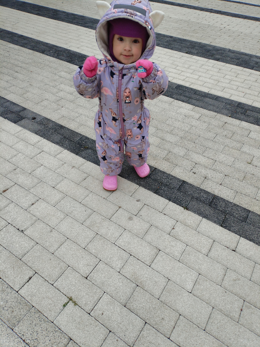 Там карусельку они прилюбили. Но не кататься на ней, а заходить и спрыгивать. Летом Амелия прыгала двумя ногами. Сейчас в куче одежды неудобно, шагала поочередно ногами. Сколько ж энергии. Туда-сюда и обратно.