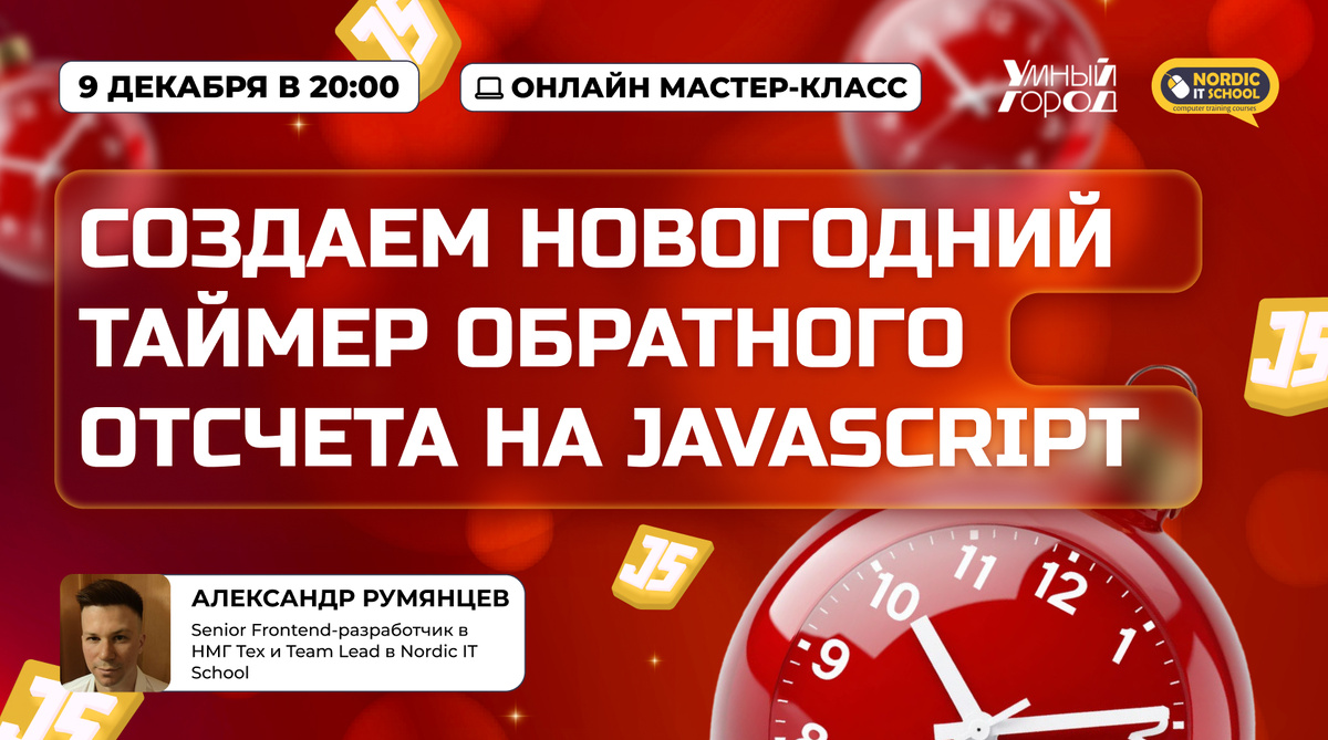 9 декабря в 20:00 приглашаем вас на онлайн мастер-класс “Создаем новогодний таймер обратного отсчета на JavaScript”