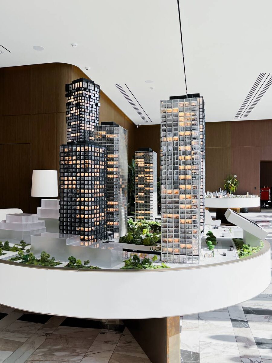 В отделе продаж застройщика «Pioneer» установлен макет строящегося жилого комплекса «High Life». Обратите внимание на детали. Редко, когда в модельных образцах можно видеть помещения, расположенные внутри представленных объёмов. А тут ещё и фигурки жильцов присутствуют. В общем, сделан акцент на максимальной проработке проекта. А значит, эта экспозиция должна передавать наиболее точную информацию по архитектуре корпусов и благоустройству дворовой территории. #highlife #макет 😊 Небоскрёбы России