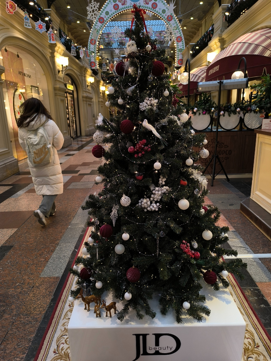 Как вы уже знаете, ходить в ГУМ на выставку новогодних ёлочек это уже ежегодная новогодняя традиция, как и ряд других новогодних традиций. Каждый раз выставку ёлочек жду, как самый настоящий праздник. И это совершенно бесплатно. Вы просто приходите в ГУМ и гуляете по его линиям. Может быть покупаете мороженое. И наслаждайтесь окружающей вас красотой... Продолжаем прогулку по выставке и магазину. Ёлочка, оформленная в дизайне Кинозала ГУМа. Один раз ходили кинозал ГУМа. Понравилось. Зал уютный, дышится в нём легко. И фильм посмотрели с удовольствием. Сфотографировала ёлочку в витрине магазина фарфора известного испанского бренда "LIadro", который сосредоточен на дизайнерской скульптуре, а не на посуде. Когда-то коллекционировала колокольчики. И в моей коллекции есть новогодний колокольчик из фарфора этого бренда. Ёлочка от Гастронома №1. В этом году оформлена гирляндами из маленьких яблочек и декором прошлых лет Во время прогулки по магазину можно выпить сока на разлив из традицио