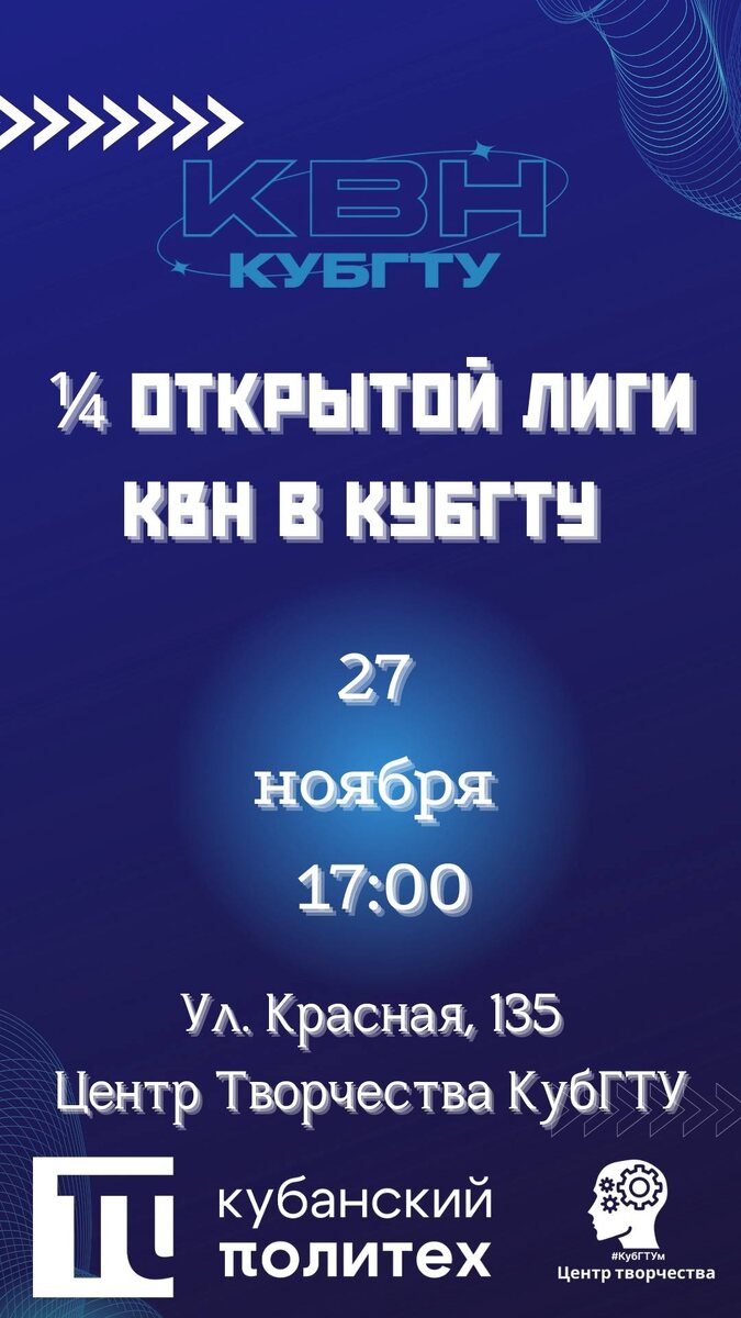 🎉1/4 Финала Открытой Лиги КВН КубГТУ! Жаркие шутки, безумный смех и море эмоций гарантированы! Приходи один или с друзьями — будет весело! В программе: — Приветствие — Разминка Участники игры: 1.«Идеальные девушки» - КубГТУ 2.«Леся Овсянникова» - Краснодар 3.«Сборная станицы Медведовской» - ФНГЭ 4.«Ломать - не строить» - ФАСАД 5.«Децибелы» - Краснодар 6.«Сопрано» - ФЭУБ 7.«Ва-банк» - АМТИ 8.«Всё сложно» - ФНГЭ 9.«Смешные типсоны» - ИТК + ФИМТ 10.«Чикиряут» - КубГУ 11.«Корнишоны по-французски» - ФБПП 🎁А ещё в ходе игры среди зрителей будут разыграны крутые призы! Ведущий открытой лиги КВН КубГТУ - Андрей Сафронов🔝 ⏰27 ноября в 17:00 📍Ул. Красная, 135 (2 этаж), Центр творчества КубГТУ🗿 Приходи и поддержи команду своего факультета. Подписаться на Центр Творчества: 📱 Телеграм 📱 ВК #ЦентрТворчестваКубГТУ #КубГТУм #КубГТУ #КубанскийПолитех #КВНКубГТУ