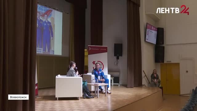 Сила в людях. Герой России, космонавт-испытатель Сергей Ревин встретился с молодежью во Всеволожске. Пообщаться с гостем приехали более 200 воспитанников кадетских классов, юнармейцы, волонтеры, учащиеся школ и колледжей Всеволожского, Приозерского, Ломоносовского, Гатчинского и Тосненского районов. Встреча прошла в рамках всероссийского проекта «Диалоги с героями». С участниками познакомилась корреспондент ЛенТВ24 Альфия Бекарсланова. Мы готовы лететь в космос, и полетели, вот эта часть называется головная часть, там находится космический корабль и наш экипаж. Космонавт-испытатель Сергей Ревин рассказывает детям, как стартует ракета, как в невесомости организован быт, что едят члены экипажа, как работают и отдыхают. Его полет длился 125 суток с мая по сентябрь 2012 года. За это время было проведено немало исследований, эти задачи выполняет каждый член экипажа и благодаря профессионализму внештатных ситуаций на станции не возникало. Героизм — это каждый день работы в космическом простр