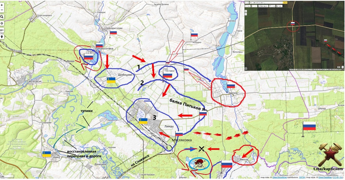 И в продолжении темы Красного Лимана ГВ «Запад» в ходе наступления блокировали часть сил 117 обр ТерО в районе н.п. Диброва (голубой овал с черепом) схемы и карты