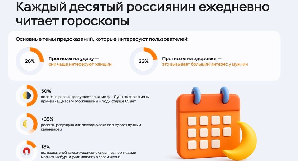 Социальная сеть «Одноклассники» провела исследование среди россиян, чтобы узнать, как они относятся к гороскопам, лунным календарям и прогнозам погоды. Опрос приурочили к концу года, когда интерес к такому контенту особенно высок. Специалисты ОК выяснили, верят ли пользователи в предсказания, насколько часто их изучают и как сильно они влияют на их планы. Половина россиян (50%) считают, что фазы Луны оказывают влияние на их жизнь. Чаще всего так думают женщины и люди старше 65 лет. Более 35% россиян пользуются лунным календарем регулярно или время от времени. Особенно активно его применяют люди после 65 лет. «Отвечая на вопрос, для чего россияне обращаются к лунному календарю, респонденты отметили, что пользуются им для садоводства и ухода за растениями (44%). Каждый третий (35%) пользователь обращается к лунному календарю просто из любопытства. Также в топ популярных причин вошел контроль самочувствия (21%)», — отметили в пресс-службе. Половина опрошенных также уверены что гороскопы в