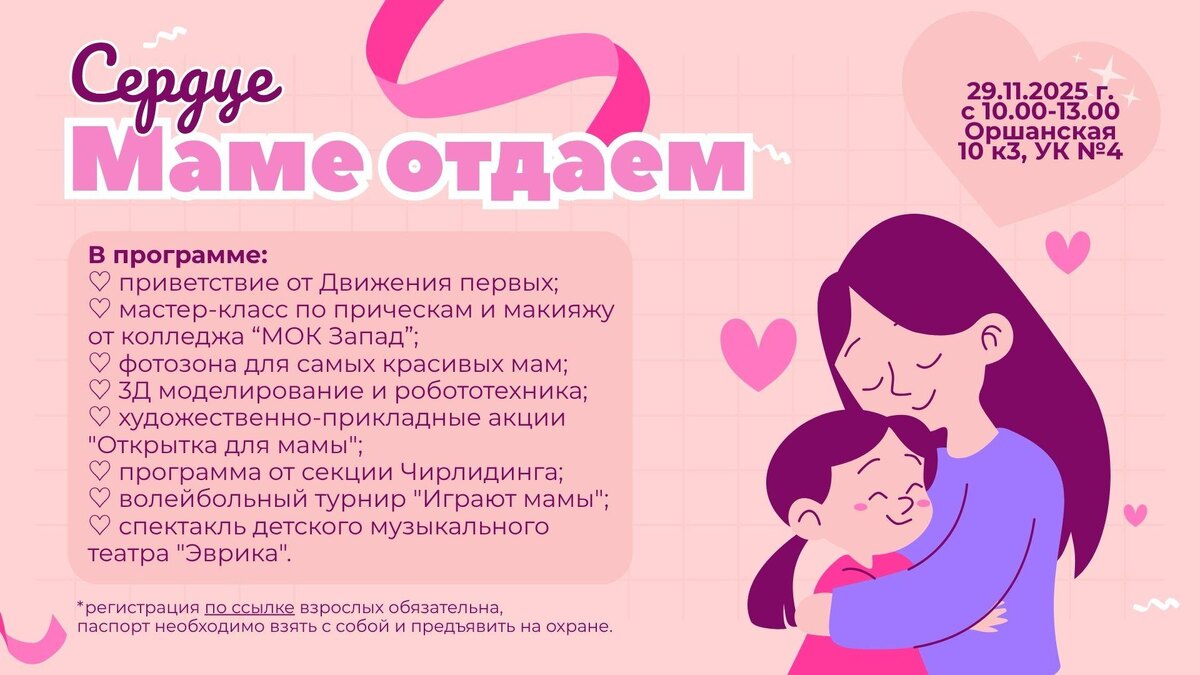 🧡 Праздник «Сердце маме отдаем» Дорогие друзья! Приглашаем вас 29 ноября на большой праздник, посвященный Дню матери! В программе: 🎤 Приветствие от «Движения Первых»; 💇♀️ Мастер-класс по прическам и макияжу от колледжа МОК «Запад», а также экспресс-лекция по теме «Проблемная кожа» от ведущих мастеров колледжа! Мы приглашаем вас в качестве моделей, где вы сможете сделать красивый макияж, а после сделать фото на яркой фотозоне. Вы сможете познакомиться с профессиями и педагогами колледжа МОК «Запад», наших ближайших партнеров и соседей; ✍️Аквагрим для маленьких гостей; 😍Презентация семейного клуба «Олдбрук» Дарьи Аполонской; 🤖 3D-моделирование и робототехника; 🎨 Мастерская «Открытка для мамы»; 🏐 Волейбольный турнир для мам; ✨ Яркие выступления чирлидеров; 🎭 Спектакль театра «Эврика» в 12.00, театральный буфет (оплата картой Москвёнок или наличными). 📅 Когда: 29 ноября, с 10:00 до 13:00 📍 Где: ул. Оршанская, д. 10, корп. 3 ❗️Важно! Регистрация для взрослых обязательна. Не з