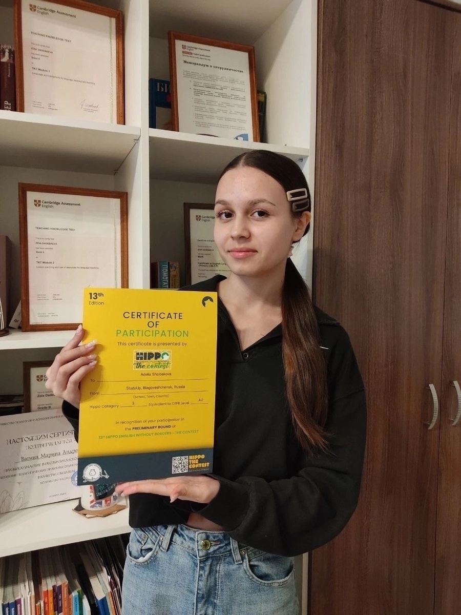 Руководитель школы рассказала, что из 93 224 участников из 71 страны всего 317 конкурсантов получили возможность представлять свои страны в финале Девятиклассница из Благовещенска Аделия Шайбакова демонстрирует выдающиеся успехи в изучении английского языка. С ранних лет она проявляла интерес к этому предмету и уже во втором классе начала его осваивать. Родители, заметив увлечение дочери, приняли решение отдать её в школу английского языка StudyUp. Сегодня Аделия успешно осваивает уровень C1, который обычно изучают студенты лингвистических вузов. Её успехи не остались незамеченными: в этом году она представляла Россию на Финале международной олимпиады по английскому языку Hippo, которая прошла в Италии. Руководитель школы StudyUp Зоя Дадебаева рассказала, что из 93 224 участников из 71 страны всего 317 конкурсантов получили возможность представлять свои страны в финале. Среди них оказалась и Аделия Шайбакова. Этот успех стал результатом упорного труда и целеустремлённости юной лингвист