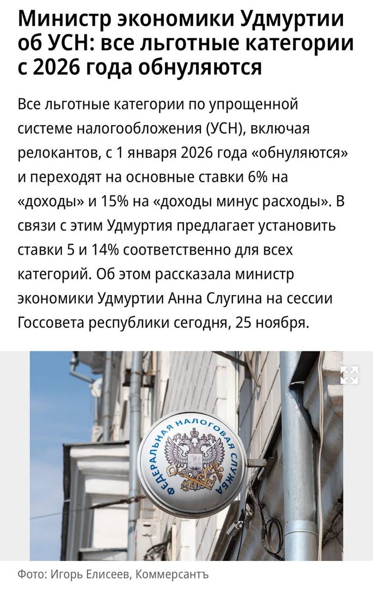 ⚡В Удмуртии с 2026 года все льготы по УСН обнуляются Первый пошел. Источник