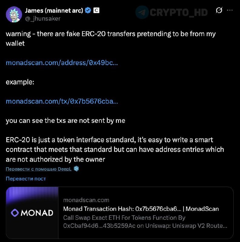 #mon #скам ⚠️ Пользователей Monad атакуют фейковыми переводами. Технический директор компании Джеймс Хансейкер предупредил, что злоумышленники пытаются подменить адреса, чтобы перехватить реальные токены пользователей. Как работает схема: • Мошенники создают ванити-адреса (vanity addresses), совпадающие с первыми и последними символами жертвы. • Отправляют нулевые фейковые переводы, чтобы попасть в историю транзакций. • Рассчитывают, что жертва скопирует этот поддельный адрес при следующем бридже или переводе и отправит на него реальные токены. Ранее: - MON за $10 ? - «высасывает» ликвидность - листинг Crypto Headlines