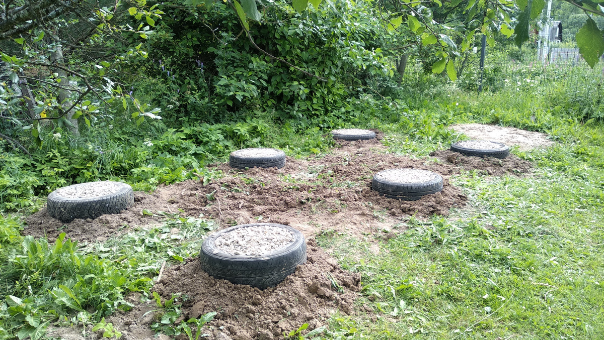 Наконец решила написать о постройке своего курятника. Прошло уже больше года как на нашем участке появилось и функционирует это строение. Поэтому сейчас уже можно смело сказать , что эта стройка прошла вполне успешно. А начинается любая постройка с фундамента. Так как курятник это довольно легкая постройка, то фундамент я делала сама из старых покрышек: Размер строения 4 м на 2 м. На эту площадь я сделала 6 столбиков из покрышек. Каждый столбик состоит из 2 покрышек, одна полностью закопана в земле, вторая немного возвышается . Тут самое сложное было выставить диагонали и вывести уровень. Покрышки уложила на хорошо утрамбованную подушку из песка. Наполняла покрышки щебенкой . Главное хорошо и тщательно утрамбовать щебенку, чтобы не осталось нигде пустот. Вся работа в одни женские руки заняла дня три - тяжеловато было. Больше всего времени конечно ушло на разметку . Каркас курятника с наружной обшивкой строили наемные рабочие. В основном на стройку пошли обрезные доски 150*25, на обр