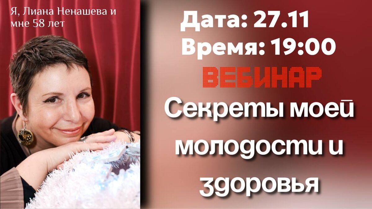 Дорогие мои 💛 Хочу пригласить вас на очень личную и важную встречу. В четверг, 27.11, в 19:00 мск я проведу вебинар: 🌿 «Секреты моей молодости и здоровья» Мне 58 лет. И я часто слышу вопрос: «Лиана, как ты так выглядишь?» А я действительно: ✨ не болею ✨ не бегаю по врачам ✨ не знаю, что такое колени, желудок, миомы, климаксы и все эти «неизбежные возрастные истории» ✨ чувствую себя прекрасно ✨ имею отличные анализы ✨ живу активно, легко и в ресурсе И это не «чудо» — это система, которую я выстроила годами. Я обучалась антиэйджингу у ведущих специалистов Голливуда — у тех, кто работает со звёздами уровня Мадонны и других мировых имён. И сегодня именно эти знания помогают мне жить так, как я живу. В четверг я расскажу: 💊 какие препараты и БАДы я принимаю 🧘 какие практики использую 🕊 как строю свой день ⚡ что лежит в основе моего молодого состояния 🌸 и как каждому человеку можно выстроить путь к здоровью без мучений и страха Это будет честный, открытый разговор. Приходите.