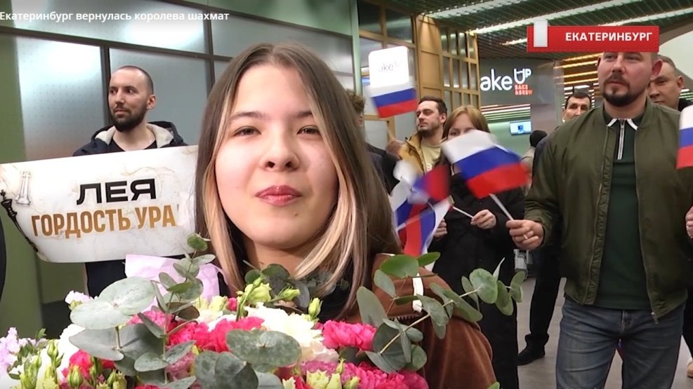 Накануне вечером в Екатеринбург вернулась член женской сборной России по шахматам Лея Гарифуллина. Россиянки, в том числе три – из УрФО, выиграли чемпионат мира по шахматам, показав лучший результат на соревнованиях в Испании. Лея Гарифуллина – чемпионка мира по шахматам / video Как сообщает «Новый День», Лею в Кольцово встречали СМИ и несколько десятков болельщиков, девушке дарили цветы и поздравляли с победой. Лея, в свою очередь, поблагодарила всех за теплую встречу, а родителей и президента региональной общественной организации «Федерация шахмат Свердловской области» Андрея Симановского – за помощь и поддержку. По словам чемпионки, на соревнованиях в Испании царила дружественная атмосфера. «Все было классно, все хотели победить, но мы выиграли все партии и показали высший класс, оставив позади, в том числе, США и Китай», – отметила Лея Гарифуллина. По признанию шахматистки, в этот вид спорта ее привел брат, который тоже занимается шахматами. И теперь она хочет играть дальше для тог