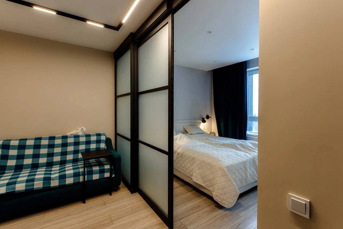 В эфире однушка 40 м², и наша перегородка. В данном случае перегородка отделяет спальню от гостиной и выполнена в деревянном профиле с покрытием экошпон в цвете венге. Стекло — каленое, матовое. И это ключевой момент. Так как окно размещено только в спальне, матовое стекло мягко пропускает дневной свет в гостиную, но при этом полностью скрывает всё, что происходит в зоне сна. Никакой лишней открытости, только деликатный свет и комфорт. Конструкция состоит из трёх створок: одна стационарная и две раздвижные. За счёт этого проём остаётся широким. Вот так даже небольшая квартира превращается в продуманное и сбалансированное пространство, где есть и уединение, и свет, и ощущение простора ❤️