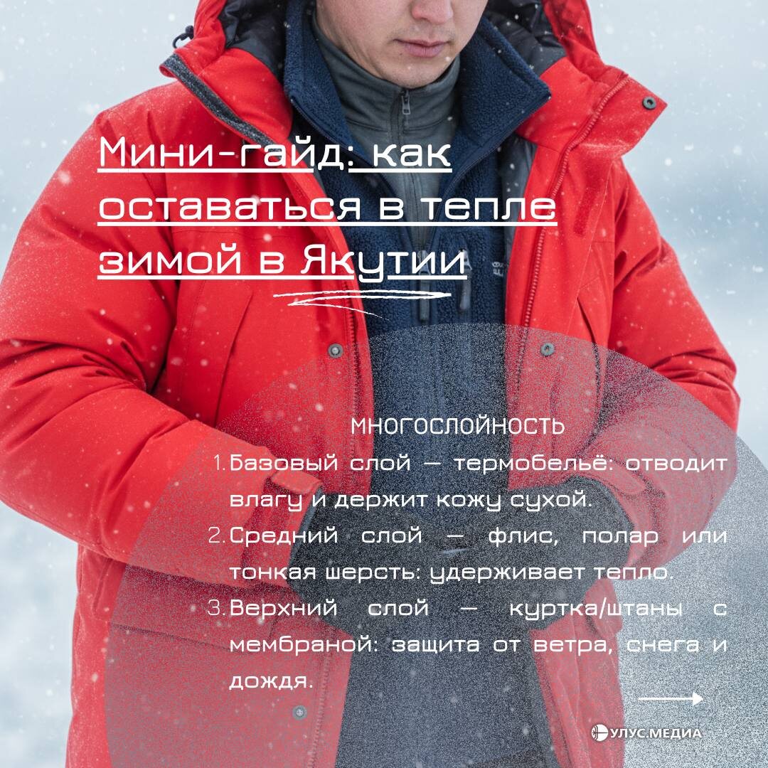 ❄️ Как оставаться в тепле зимой в Якутии Зима в Якутии – это не просто холод. Морозы опускаются до -50 °C, а ветер усиливает ощущение холода. Чтобы оставаться в тепле, важно правильно подбирать одежду, обувь и аксессуары, сочетая комфорт и функциональность. 🧥 Многослойность Это основа тепла. Каждый слой выполняет свою функцию: 1. Базовый – термобельё. Плотно прилегает к телу, отводит влагу и сохраняет кожу сухой. 2. Средний – изоляционный: флис, полар или тонкая шерсть удерживают тепло, создавая воздушную «подушку». 3. Верхний – защитный: куртки и штаны с мембраной защищают от ветра, снега и дождя. Между слоями должно оставаться немного воздуха – это дополнительная теплоизоляция. 🥾 Обувь Качественная зимняя обувь – залог сухости и тепла ног: • Выбирайте на полразмера больше, чтобы надеть тёплые носки и создать воздушную подушку. • Утеплитель: шерсть, пух или современный лёгкий синтетический утеплитель. • Мембрана и водонепроницаемые материалы защитят от снега и влаги, а подошва