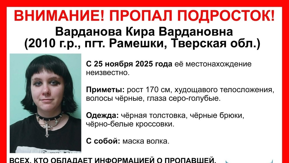В Тверской области с 25 ноября пропали двое несовершеннолетних — 14-летний Ибрагим Гасанов и 15-летняя Кира Варданова. Оба проживают в посёлке Рамешки, их местонахождение до сих пор неизвестно. По данным волонтёрского поисково-спасательного отряда "Сова", Ибрагим Гасанов 2011 года рождения (14 лет), рост — 182 см, худощавого телосложения, волосы темно-русые, глаза карие. В день исчезновения был одет в черную куртку, черные штаны и черные кроссовки. Кира Варданова 2010 года рождения (15 лет), рост — 170 см, также худощава, волосы черные, глаза серо-голубые. При себе у неё была маска волка. Была одета в черную толстовку, черные брюки и черно-белые кроссовки. Всех, кто располагает информацией о местонахождении подростков, просят незамедлительно сообщить об этом по телефонам горячей линии: