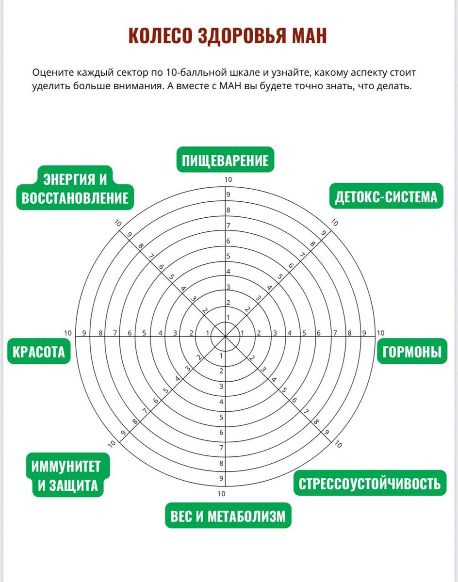 💚 Колесо здоровья МАН: с него начинается честная диагностика Чтобы понять, что именно тянет ваше здоровье вниз, важно посмотреть на организм целиком, а не по отдельным симптомам. И именно для этого мы создали Колесо здоровья МАН — простой и мощный инструмент, который показывает, в каком состоянии находятся ваши ключевые системы. В Колесе 8 важных секторов. Оцените каждый сектор по 10-балльной шкале, и вы сразу увидите: что работает хорошо, а что проваливается и требует внимания. И вот прекрасная новость 👇 🚀 Завтра мы запускаем челлендж «Колесо здоровья: 7 дней честной диагностики», где будем шаг за шагом разбирать каждый сектор, показывать типичные ошибки и давать простые задания, чтобы вы не просто знали, а внедряли и чувствовали результат. Мы хотим давать реальную пользу — поэтому весь путь пройдём вместе. А пока можете скачать Колесо здоровья, чтобы потом заполнять в течение челленджа. 🎯 А итог подведём на онлайн-встрече 4 декабря на встрече «Как собрать пазл здоровья» мы