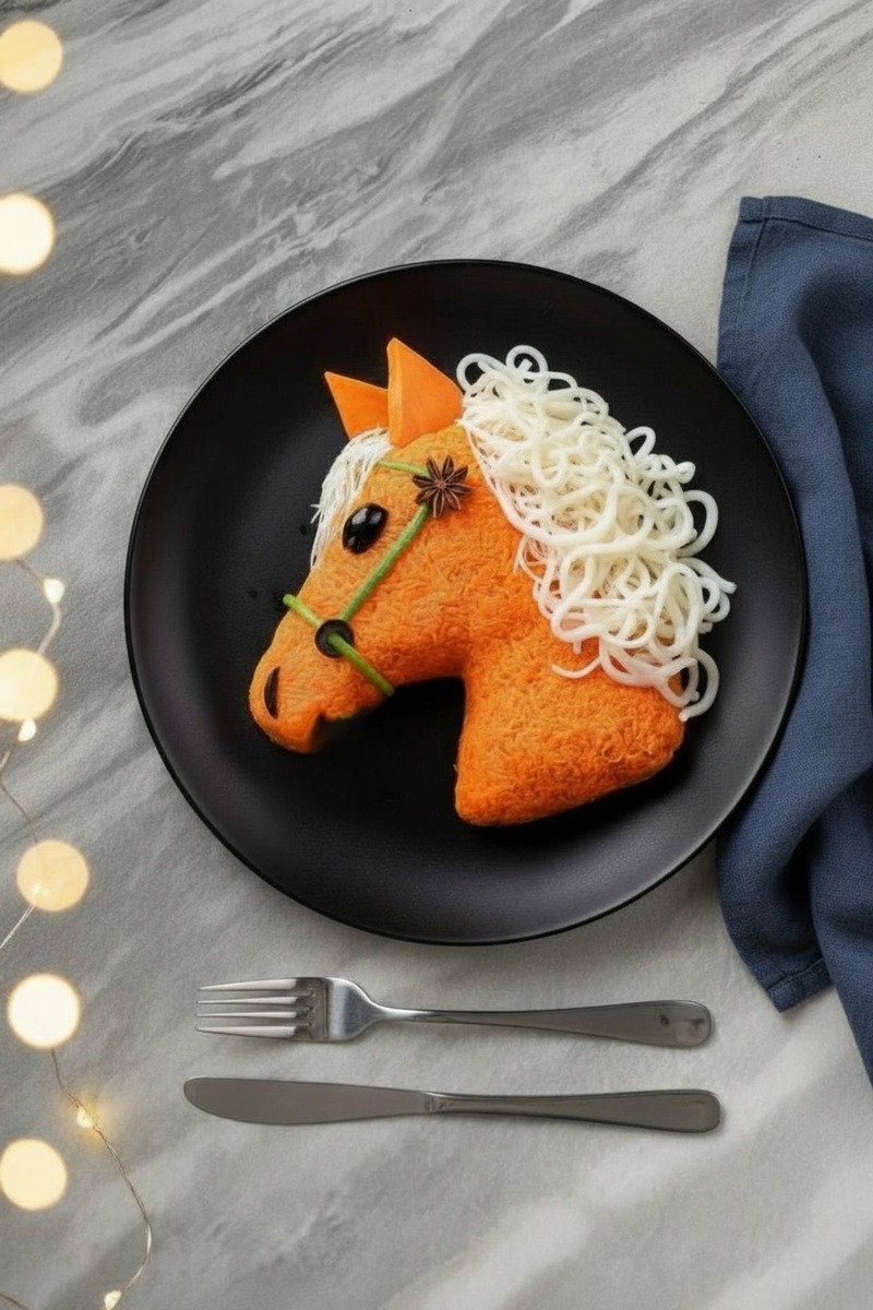 Такой салат точно станет главным украшением новогоднего или праздничного стола. Ингредиенты (основные): Для классической "шубы": — Сельдь слабосоленая (филе) — 1-2 шт. — Картофель отварной — 3-4 шт. — Морковь отварная — 2-3 шт. (плюс одна для покрытия салата и для ушей) — Свекла отварная — 2-3 крупных шт. — Лук репчатый — 1 шт. (мелко рубленный) — Майонез — по вкусу Для оформления: Грива: Фунчоза (стеклянная лапша) — 1 пучок. Уздечка: Зеленый лук (длинные перья) — несколько штук. Глаза: маслины или оливки. Ноздри: То же, что и для глаз. Уши: Дольки отварной моркови Пошаговая инструкция по сборке 1️⃣ Подготовка основы 1. Приготовьте продукты: Все овощи (картофель, морковь, свеклу) отварите до готовности и полностью остудите. Очистите. Сельдь нарежьте мелким кубиком. Лук мелко порубите. 2. Соберите салат слоями по форме как на моем фото. Это основа для головы лошади. Классический порядок слоев снизу вверх: — Картофель, натертый на терке + немного майонеза. — Слой рубле