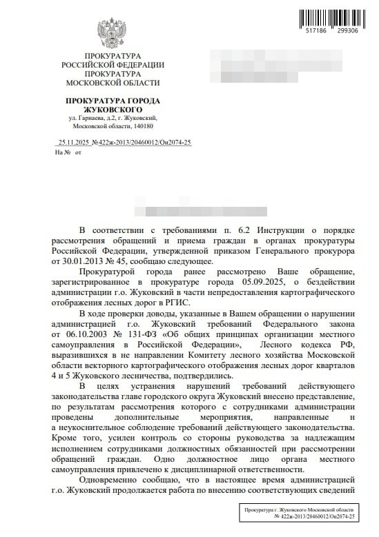 Прокуратура внесла представление главе г.о.Жуковский Паку за бездействие администрации города в части непредоставления картографического отображения лесных дорог Жуковского лесничества в РГИС. Это сделано после обращения граждан, которые настаивают на приведении лесохозяйственного учёта в соответствие с законодательством, не допускающим тотального благоустройства лесничеств. "В целях устранения нарушений требований действующего законодательства главе городского округа Жуковский внесено представление, по результатам рассмотрения которого с сотрудниками администрации проведены дополнительные мероприятия, направленные на неукоснительное соблюдение требований действующего законодательства. Кроме того, усилен контроль со стороны руководства за надлежащим исполнением сотрудниками должностных обязанностей при рассмотрении обращений граждан. Одно должностное лицо органа местного самоуправления привлечено к дисциплинарной ответственности. Одновременно сообщаю, что в настоящее время администра