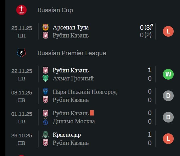 Пять последних матчей Рубина: 1 гол, 1 пропущенный.