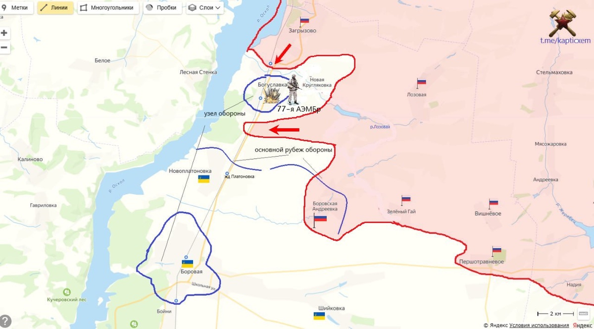 И в продолжении темы котлов Боровское направление Образовалось небольшое оперативное окружение у населенных пунктов Богуславка-Новая Кругляковка. Кого там законопатили точно сказать трудно без доступа к разведданным, но скорее всего части 77-ой аэромобильной бригады. ВС РФ физически перерезали шоссе на Новоплатоновку. И в целом, противник отводит с этого берега Оскола свои подразделения и готовится сдать территории. 3-я штурмовая бригада отсюда переброшена под Красный Лиман. схемы и карты