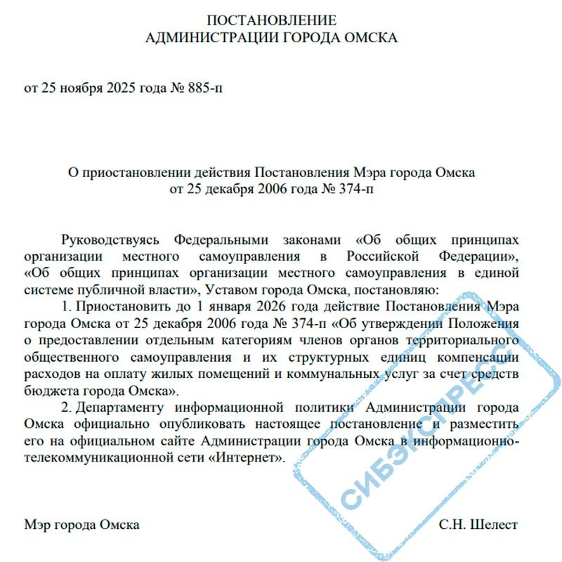 Омские власти отменили компенсацию оплаты ЖКХ для активистов ТОС и старших по домам. Их зачастую используют для мобилизации на выборах Мэр Омска Сергей Шелест («Единая Россия») подписал постановление о приостановке льгот по оплате коммунальных услуг для старших по домам и руководителей органов территориального общественного самоуправления (ТОС). Документ опубликован на сайте администрации. «Приостановить до 1 января 2026 года действие постановления мэра от 25 декабря 2006 года „Об утверждении положения о предоставлении отдельным категориям членов органов территориального общественного самоуправления и их структурных единиц компенсации расходов на оплату жилых помещений и коммунальных услуг за счет средств бюджета города“», — сказано в документе. По замороженному постановлению мэрии старшие по домам, члены комитетов ТОС, председатели квартальных комитетов и молодёжных советов ТОС могли рассчитывать на компенсацию коммуналки за одну квартиру вплоть до полной её оплаты. Но размер выпла