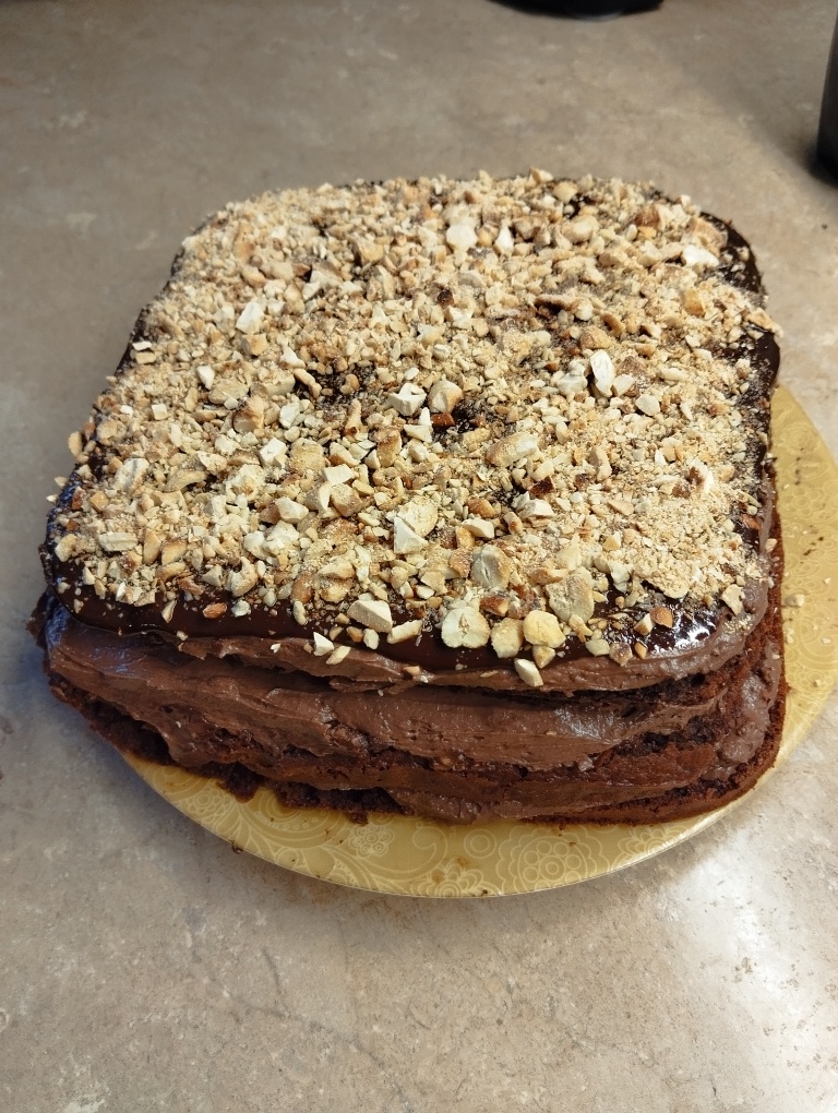 Я изменила оригинальный рецепт и подогнала все под себя. Конкретно этот торт я делала для тестирования перед предстоящими праздниками. Я не была уверена, что все получится и нам понравится. У меня сильно поднялся бисквит, только 1 см был в форме нормально, а потом начинался бугор, с которым вообще непонятно, что было делать. Я отыскала инструкцию к духовке и хочу попробовать печь на других режимах. Еще я попробую накрывать форму фольгой, так бисквит должен пропекаться более равномерно. Я чувствую, мне нужно испечь еще несколько тортов, чтобы научиться. Хехе Первый раз для торта я использовала орехи кешью и мне понравилось. Я обжарила их на сухой сковороде и потом измельчила. Орешки получились не жесткие и очень ароматные. В этом торте есть хрустящий слой. Я использовала вафли в шоколаде с орешками Яшкино, но мне совершенно не понравился их вкус, вкус дешевого заменителя какао и маргарина. Хочу попробовать фиолетовый Степ в следующий раз. Там есть карамель, но они хотя бы вкусные. Пона