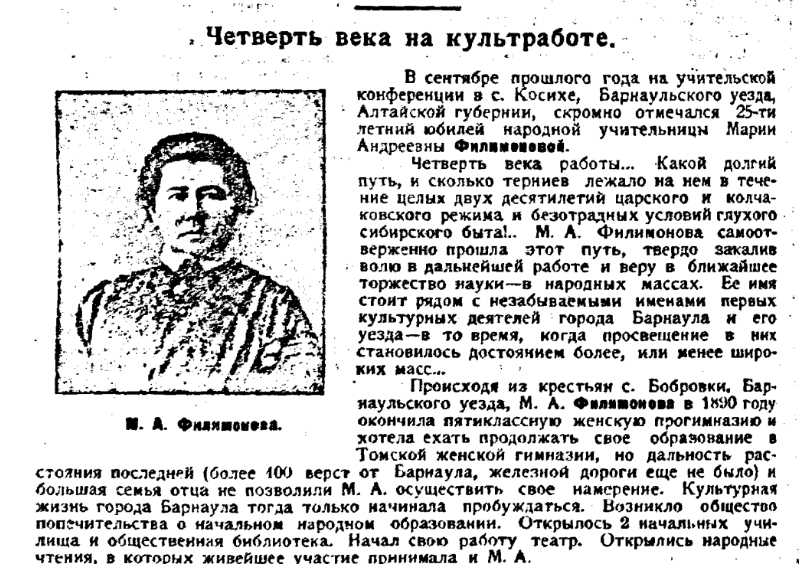 Хорошо, когда есть люди, которые занимаются тем же делом, что и ты, когда есть с кем обменяться информацией, обсудить дальнейший план поисков, вместе порадоваться удачным находкам. Валентина Симанова, жительница Барнаула, до недавнего времени не была знакома с Малахово, но так случилось, что наши исторические интересы пересеклись, и она пополнила нашу копилку старых фотографий, фактов. Валентина воссоздала биографию Марии Андреевны Филимоновой, малаховской учительницы 1904-24 гг, найдя записи о её рождении, бракосочетании и др. , а также помогла выяснить, какая же, всё-таки из учительниц застрелилась в малаховской школе в 1903 году. Статью можно прочитать в группе ВК Свято-Троицкой церкви с. Косиха Я рекомендую всем подписаться на эту группу, там освещается духовная жизнь Косихинского района в настоящий момент и размещаются данные о дореволюционной деятельности наших приходов (в том числе и малаховского)