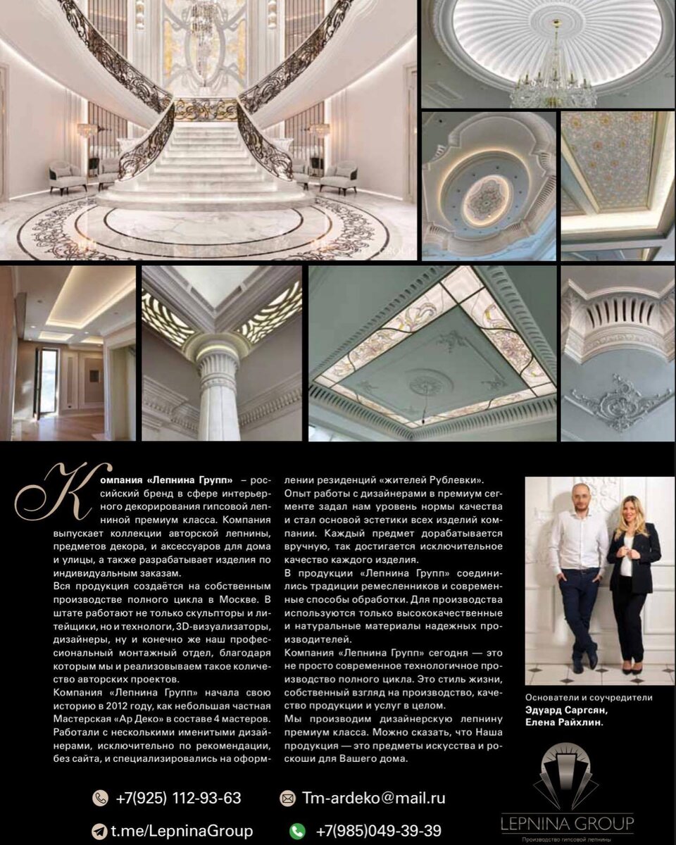 ↗ Коротко о нас... 😉 Welcome Всех, кто ценит безупречное качество, соблюдение сроков и для кого важно, чтобы проект соответствовал визуализации на 100%. Я и моя супруга Елена Райхлин всегда гарантируем идеальный результат, и мы открыты к сотрудничеству с новыми дизайнерами и интересным сложным проектам! Обращайтесь! 🤝 🎯 Lepnina Group ☎ Тел: +7(925)112-93-63 📭 Емайл : lepnina-group@yandex.ru 🌐 Сайт : https://lepninagroup.ru/ #лепнина #лепнинаМосква #сотрудничество #знакомство #новыйпроект #отделкадомов #производстволепнины #монтажлепнины