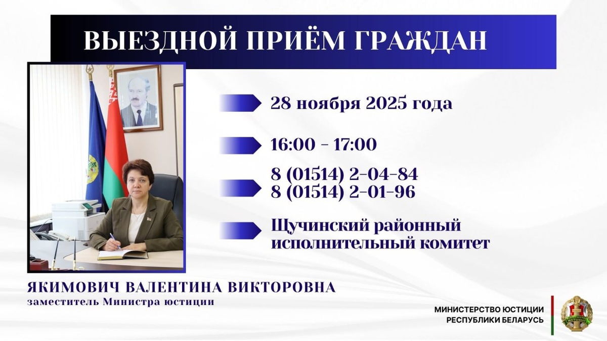 🗓 28 ноября 2025 года с 16:00 до 17:00 заместитель Министра юстиции Республики Беларусь Якимович Валентина Викторовна проведет выездной
