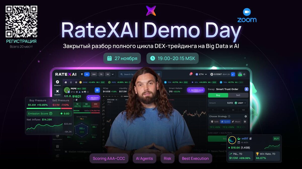 В ответ на пост Напоминаю, уже завтра в чт 27.11 в 19:00 MSK делаю закрытый RateXAI Demo Day в Zoom. Покажу наш полный цикл DEX-трейдинга: скоринг AAA–CCC, AI-агенты (-99% шума), риск-модели, терминал и потоки капитала. В конце — как мы растем и какие партнерские форматы сейчас открыты. Если актуально — кину ссылку. Мест до 20 Регистрация через бот @RateXAI_bot