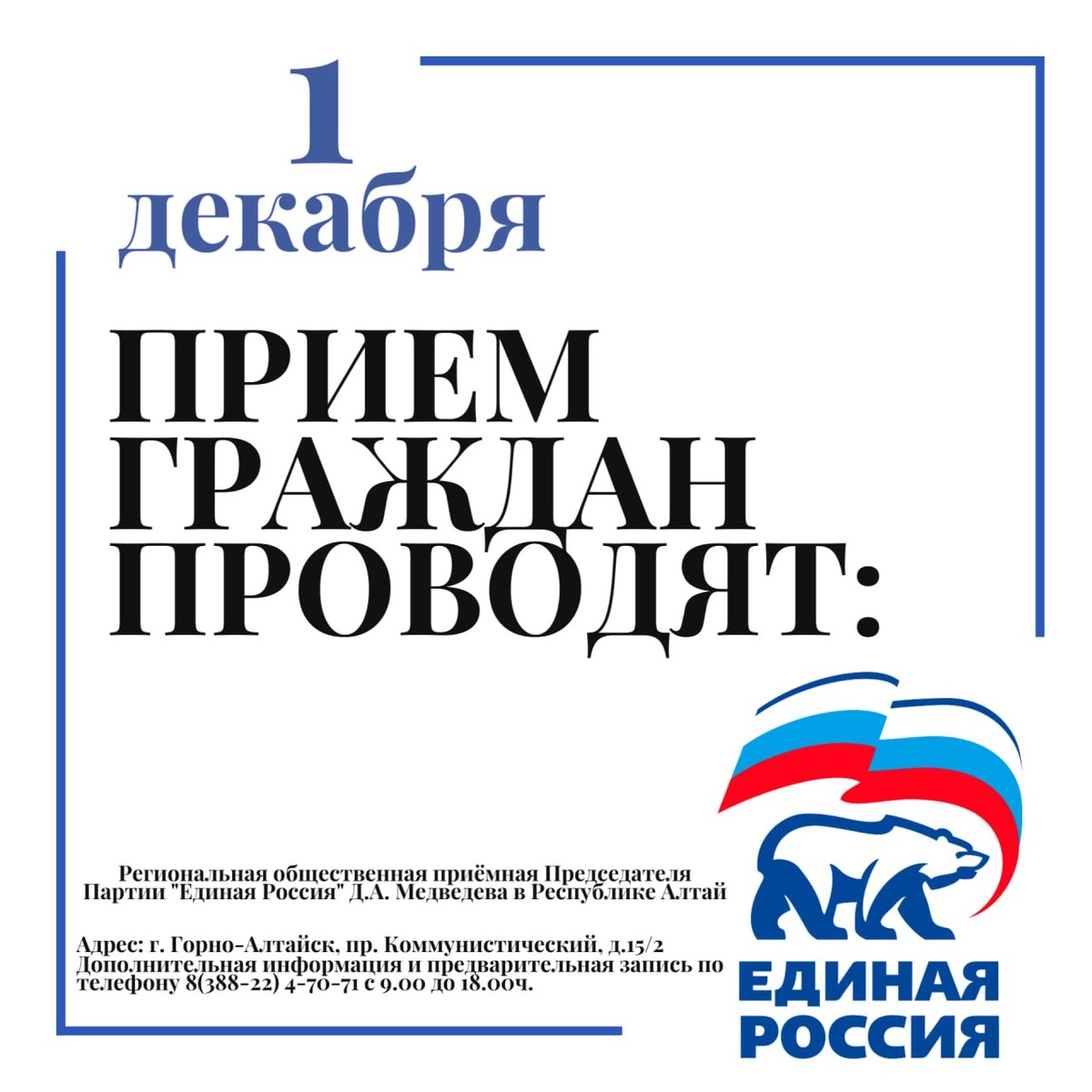 ❕ "Единая Россия" объявляет о старте традиционной Декады приемов граждан, приуроченной к Дню рождения партии. Основной площадкой для проведения приемов станет Штаб общественной поддержки. 🗓️ С 1 по 10 декабря включительно жители Республики Алтай смогут обратиться со своими вопросами к депутатам различных уровней, представителям профильных ведомств. Каждый день Декады будет посвящен определенной тематике, что позволит более эффективно решать проблемы граждан. Тематические приёмы ориентированы на решение наиболее актуальных для жителей региона вопросов: ЖКХ, дошкольное и школьное образование, здравоохранение и социальная поддержка. Эти темы традиционно лидируют в обращениях, поступающих в региональную общественную приемную партии "Единая Россия". Приемы будут проводиться как в очном, так и в дистанционном формате, что позволит обеспечить максимальную доступность для всех жителей Республики Алтай. Особое внимание обращаем на День приема граждан 1 декабря: 🕚 11.00-12.00 ч. – Ялба