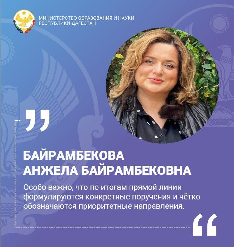 Руководитель Республиканского центра образования города Каспийска — о прямой линии с Главой республики, которая состоится уже завтра. Уверена, что форматы открытого диалога имеют огромное значение в развитии нашей республики, поскольку они позволяют напрямую услышать не только актуальные проблемы жителей, но и вектор стратегического развития, заданный руководством. Этот открытый разговор подтверждает: наша с вами ежедневная работа — это вклад в будущее Дагестана. Те вызовы, которые он обозначает, — это и наши с вами вызовы. В рамках предыдущих «прямых линий» с нашим Главой — Сергеем Алимовичем Меликовым — мы наблюдаем, что он уделяет особое внимание сфере образования, поднимая ключевые вопросы, находящиеся в фокусе нашей ежедневной работы: повышение качества образования, укрепление материально‑технической базы школ, поддержка педагогов. Очень важно, что по результатам обращений даются конкретные поручения и обозначаются приоритеты, такие как развитие цифровой образовательной среды, у