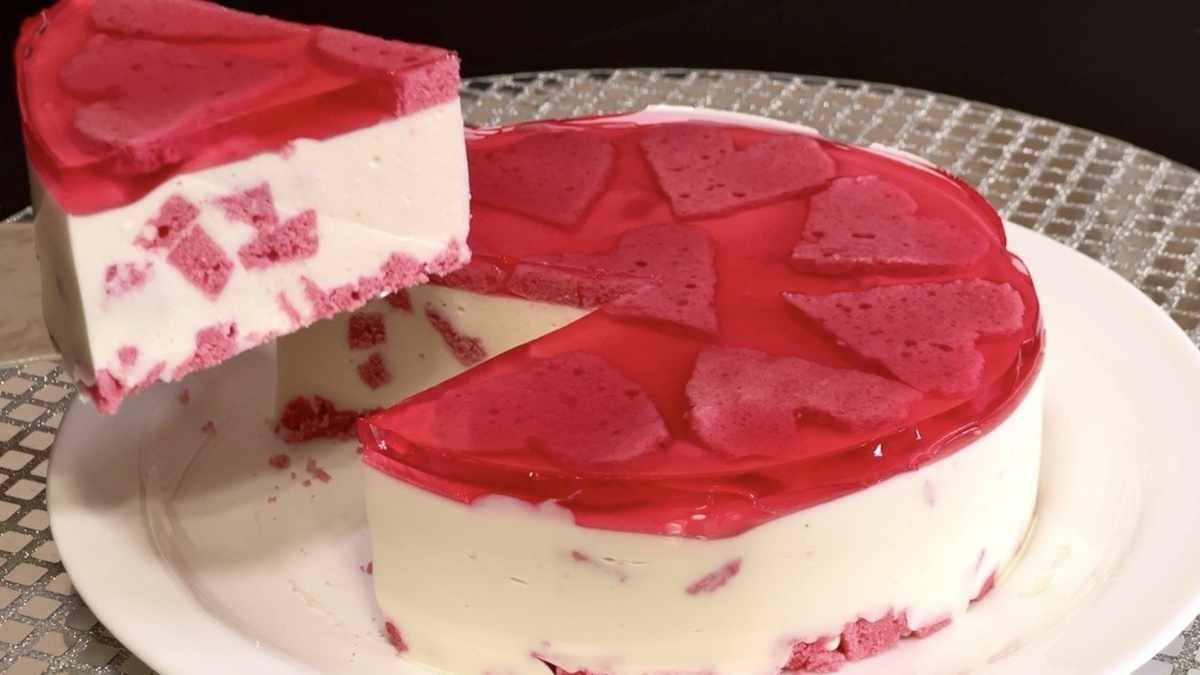 - Нарежьте порционными кусочками. Розовые сердечки внутри прозрачного желе и воздушная текстура суфле порадуют глаз и подарят незабываемый вкус.