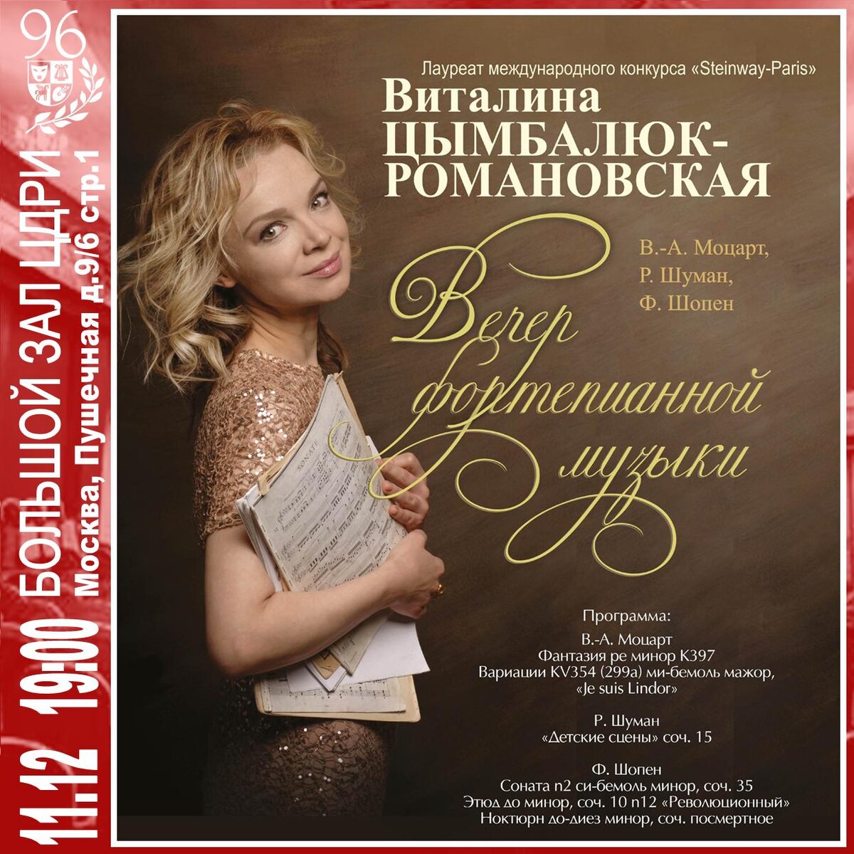 Вечер фортепианной музыки — Виталина Цымбалюк-Романовская Лауреат международного конкурса «Steinway-Paris» Виталина Цымбалюк-Романовская — пианистка, закончила десятилетку и консерваторию в Киеве и ассистентуру-стажировку в ГКА им. Маймонида в Москве, лауреат международного конкурса в Париже, участник мастер-классов в Моцартеуме (Австрия) и Тель-Хай (Израиль). В программе прозвучат произведения В.-А. Моцарта, Р. Шумана и Ф. Шопена. Концерт посвящен памяти педагога, профессора Игоря Михайловича Рябова (1930–2006). Программа: