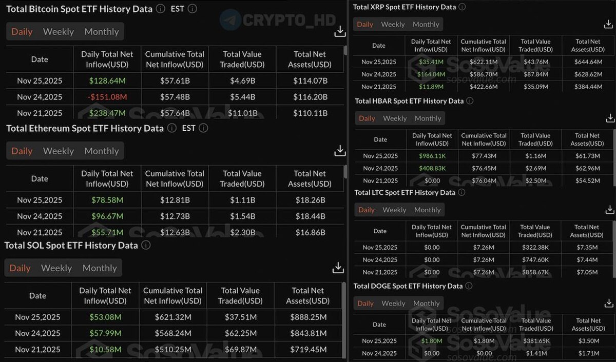 πΌ ΠΠ ΠΠ’ΠΠΠ Π΄Π΅Π½Π΅Π³ Π² Π°ΠΌΠ΅ΡΠΈΠΊΠ°Π½ΡΠΊΠΈΠ΅ ΡΠΏΠΎΡΠΎΠ²ΡΠ΅ ETF (SV) Π€ΠΈΠ½ΠΏΠΎΡΠΎΠΊΠΈ Π·Π° Π²ΡΠ΅ΡΠ°ΡΠ½ΠΈΠΉ Π΄Π΅Π½Ρ: βͺ#BTC = +$128,640,000. βͺ#ETH = +$78,580,000. βͺ#SOL = +$53,080,000 (21 Π·Π΅Π»Π΅Π½ΡΠΉ ΡΠΎΡΠ³ΠΎΠ²ΡΠΉ Π΄Π΅Π½Ρ ΠΏΠΎΠ΄ΡΡΠ΄). βͺ#XRP = $35,410,000. βͺ#HBAR = +$986,110. βͺ#LTC = $0. βͺ#DOGE = $1,800,000. Crypto Headlines