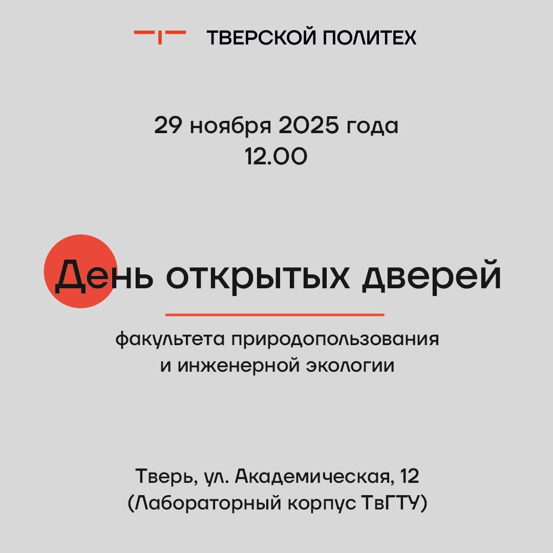 📢День открытых дверей пройдет на факультете природопользования и инженерной экологии ТвГТУ 29 ноября 2025 года абитуриентов и их родителей приглашают на День открытых дверей на факультете природопользования и инженерной экологии Тверского государственного технического университета. На мероприятии можно будет получить информацию о направлениях подготовки, по которым проходит обучение на факультете, об особенностях поступления и обучения, а также задать интересующие вопросы. День открытых дверей ФПИЭ пройдет 📆29 ноября 2025 года (суббота) в 12.00 📍Адрес: Тверь, ул. Академическая, д.12 (Лабораторный корпус ТвГТУ). ☎Справки по тел. (4822) 78-70-80. #ТвГТУ #Политех #дниоткрытыхдверей #приемнаякампания #приемнаякампания2026 #абитуриент #абитуриент2026 #абитуриенту