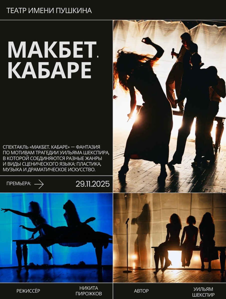 Театр им. А. С. Пушкина заставит Макбета пуститься в пляс 🎭 Случится это 29 ноября в Филиале Пушкинского. Спектакль называется «Макбет. Кабаре». Все недавние московские «Макбеты» отличаются радикальностью в сочинении миров: Андрей Кончаловский в Театре Моссовета переселил шотландских танов на Кавказ; Елизавета Бондарь соорудила на сцене Театра Наций гремучую постапокалиптическую пустошь. В Пушкинском театре «шотландскую пьесу» погрузят в стихию кабаре, точнее, в ту его разновидность, которая прижилась на наших подмостках: театральную фантазию, сливающую в одно целое элементы драматического, музыкального и пластического представлений. Премьеру готовит Никита Пирожков — актёр Театра им. А. С. Пушкина. Это его первая полностью самостоятельная режиссёрская работа; доселе ему доводилось бывать постановщиком хореографии (например, в «Космосе» Игоря Теплова) и ассистентом режиссёра (в спектакле Евгении Дмитриевой «Л.Е.С.») «Идея постановки „Макбета“ в жанре кабаре родилась из любви к Шекс
