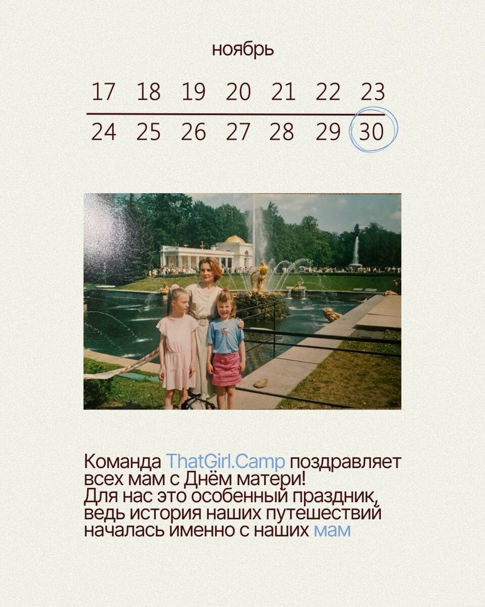 30 ноября 🩵День матери Для нас это действительно особенный день, потому что именно благодаря нашим мамам мы сегодня путешествуем, занимаемся любимым делом и создаем ThatGirl.Camp таким, какой он есть. Они первыми показали нам мир, научили жить здесь и сейчас, ценить новые места, впечатления и людей! Девчонки, обязательно поздравьте мам с этим днём. Мы признались своим мамам в любви в этих карточках🫂