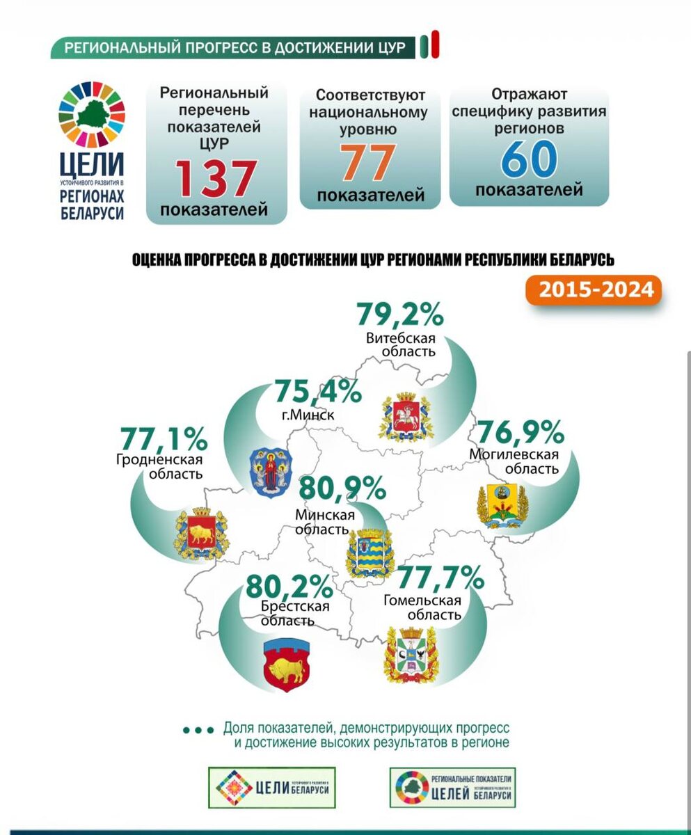 📈Белстат впервые оценил прогресс регионов страны в достижении Целей устойчивого развития 🇧🇾Среди регионов страны Витебская область в тройке лидеров: по 79,2 % анализируемых показателей достигнут значительный прогресс и высокие результаты. 🔍Оценка проведена по 245 показателям, характеризующим достижение ЦУР за 2015-2024 годы.