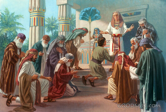 Эпизод №3.15. Первый поход в Египет за зерном Прошли годы после того, как братья Иосифа продали его измаильтянам и он оказался в Египте. Они ничего не знали о его дальнейшей судьбе (Бытие 37:25-28). Иаков же был уверен, что его любимый сын Иосиф погиб, растерзанный зверями (Бытие 37:33). Но Иосиф не погиб. В Египте Господь не оставил Иосифа (Бытие 39:2,21,23): «23 … Господь был с Иосифом и давал ему успех во всех делах». Благодаря поддержке Господа, своим качествам и способностям, а также стечению обстоятельств Иосиф обратил на себя внимание фараона и тот сделал его фактическим правителем Египта, «вторым после себя» (Бытие 41:40-44) (рис. 3.15.1): В годы изобилия под руководством Иосифа в Египте был собран большой запас зерна (Бытие 41:47-49). Затем начался голод (Бытие 41:53,54): «53 Семь лет изобилия в Египте подошли к концу, 54 и начались семь лет голода, как Иосиф и предсказал. Голод был во всех других землях, только в земле Египта была пища». Голод был жестокий и люди направляли
