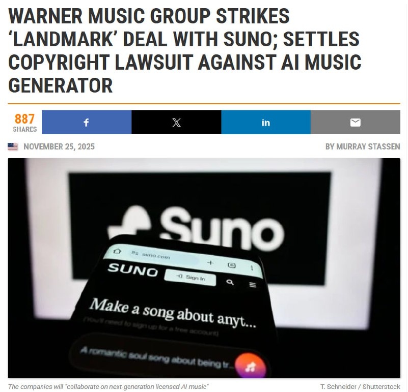 Ну точно, на ГПМХ кто-то серьёзную епитимью наложил, если не сказать - наклал. Только они решили, что поделят с ПМИ весь рынок нейросетевой музыки, как вдруг... Warner Music поставил всю многомиллиардную креативную индустрию под свой контроль. Warner Music Group прогнул Suno на совместное соглашение, которое попахивает шантажом. Теперь они вроде как партнеры, но, внимание, в 2026 году Suno должна ИЗБАВИТЬСЯ от существующих моделей и выкатить новые, кастрированные, обученные на лицензионном контенте. “several changes to the platform, including launching new, more advanced and licensed models, the current models will be deprecated”. А скачивание песен будет только за деньги: «В частности, в будущем песни, созданные на бесплатном тарифе, не будут доступны для скачивания, но их можно будет воспроизводить и делиться ими». По данным компании, пользователи платного тарифа будут иметь ограниченный ежемесячный лимит на скачивание с возможностью оплатить дополнительные скачивания. > Подробне