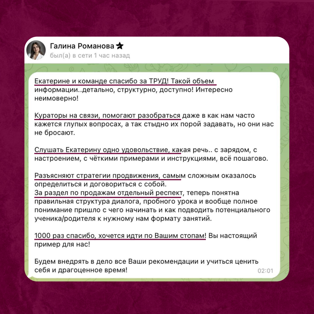 Уже чувствуется, что скоро конца года - время, когда хочется ненадолго замедлиться, оглянуться назад и честно посмотреть, что мы сделали. И сегодня я хочу рассказать, как вообще работает онлайн-школа Екатерины Дехонт для преподавателей. Последние месяцы я почти не рассказывала вам про результаты своих учеников. А между тем, через мои программы прошли уже почти 700 репетиторов. И то, как они растут - это то, чем я реально горжусь. Для меня тема отзывов всегда была непростая. Я из тех людей, кто больше думает о процессе, чем о том, чтобы меня кто-то похвалил. Всегда говорю - вам необязательно меня любить, потому что часто я на своём обучении говорю не самую приятную правду. Но важно внедрять и получать результаты. И каждый раз, когда прилетает огромное письмо с благодарностью… да, я смущаюсь. Но я читаю каждое слово, и именно такие письма напоминают мне: зачем я вообще всё это делаю. Я создаю не какие-то “мотивашки - просто думай как миллионер”, а чёткие, практические схемы, которые я с