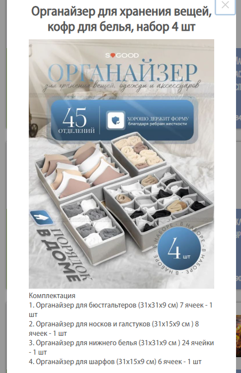 4 органайзера для вещей с разделительными перегородками, 2 больших квадратных и 2 прямоугольника поменьше.