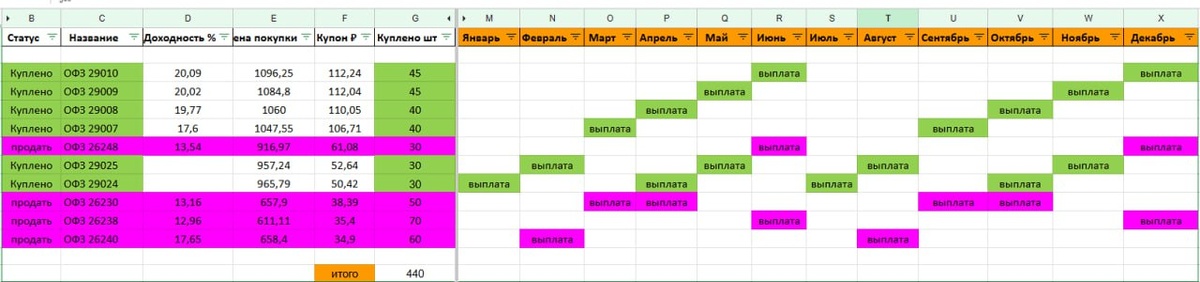 Продолжаю собирать портфель из облигаций федерального займа. 🟩 Зелёные — действующие облигации, приносят купоны ежемесячно. 🟪 Фиолетовые — на продажу, буду замещать новыми выпусками с более высокой доходностью. 💼Портфель сейчас выглядит так: 🟡ОФЗ 29007 — 40 шт. на ₽42 455,20 🟡ОФЗ 26238 — 70 шт. на ₽40 528,60 🟡ОФЗ 29010 — 45 шт. на ₽52 217,55 🟡ОФЗ 29024 — 30 шт. на ₽29 877,90 🟡ОФЗ 26230 — 50 шт. на ₽29 875,00 🟡ОФЗ 29009 — 45 шт. на ₽48 734,70 🟡ОФЗ 26248 — 30 шт. на ₽29 658,00 🟡ОФЗ 26240 — 60 шт. на ₽30 183,70 🟡ОФЗ 29008 — 40 шт. на ₽42 198,40 🟡ОФЗ 29025 — 30 шт. на ₽29 147,10 💰 Итого: 440 облигаций на сумму ₽382100,95 📆 График выплат по моему портфелю ОФЗ на 2025 год ✅Сентябрь: ОФЗ 26246 — ₽2 393 ✅ Октябрь: ОФЗ 26230 и 29008 — ₽6 321 🟢 Ноябрь: ОФЗ 29009 и ОФЗ 29025 —на ₽6 621,0 🟢 Декабрь: ОФЗ 26238, ОФЗ 26248, ОФЗ 29010 — на ₽9 361,2 💰 Всего за 2025 (с августа): ₽24 697,3 Теперь глядим на 2026г 🟢 Январь: ОФЗ 29024 — ₽1 512,6 (буду усилять) 🟢 Февраль: ОФЗ 26240 +