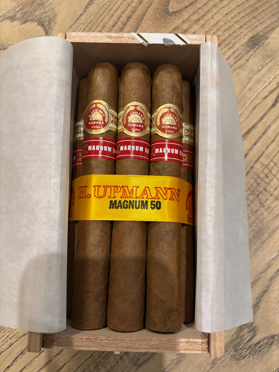 Дата дегустации: 25.09.2025 Место дегустации: Диско-Бар «Молодость» Витола: H. Upmann Magnum 50 Формат: Magnum 50 (160 мм × 50 RG) Страна производства: Куба Средний балл клуба: 78,6 Основные ароматы: древесные, землистые, минеральные, десертные, выпечка, животные Дымность: средняя Крепость: ниже средней Вкусоароматика сигары Сигара стартует живо и многообещающе. С первых затяжек раскрываются ноты кедра, земли, минералов и карамели, дополненные сливочными оттенками и ароматом кожи. Во второй трети древесные тона выходят на первый план, к кедру добавляется дуб. Основной вектор вкуса становится более прямолинейным: земля, карамель, немного сливок и кожа продолжают звучать, но уже без прежней сложности. К финалу сигара заметно теряет глубину. Всё богатство вкусов постепенно сводится к дубу, земле и жареным акцентам, оставляя послевкусие плотное, но упрощённое. Итоги На дегустации было представлено две коробки по 10 сигар. Одна — внешне безупречная, но оказалась откровенно неудачной; д